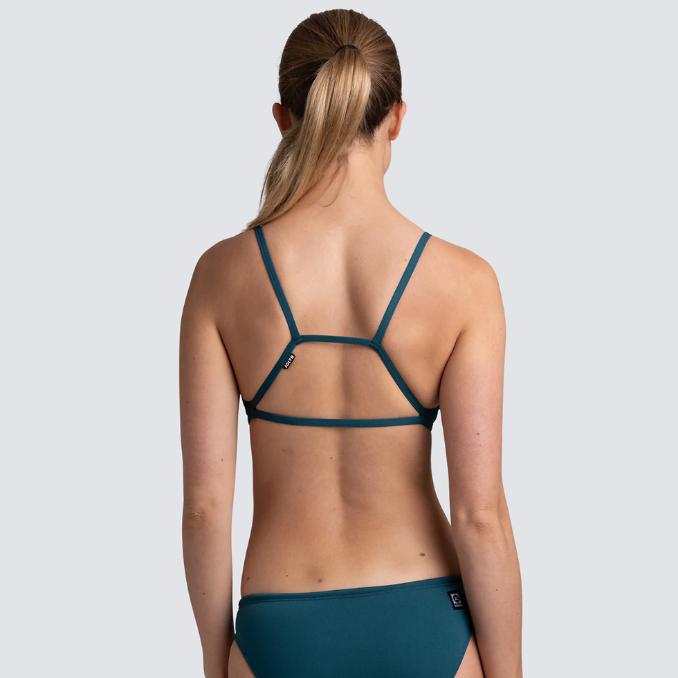 The Shara Bikini top elevates JOLYN'S classic triangle design with a thick band around the ribcage for security and four parallel straps for maximum support. Being multi-functional, it can be worn as both a bikini top and a sports bra. It's ideal for swimming and land-based activities, especially for those with smaller-sized chests.